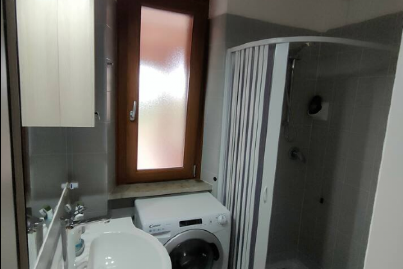Windowed bathroom with shower and washing machine
