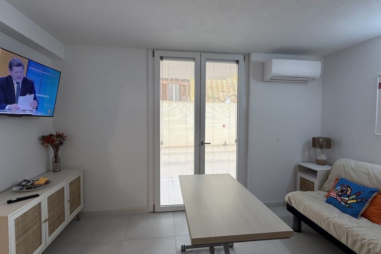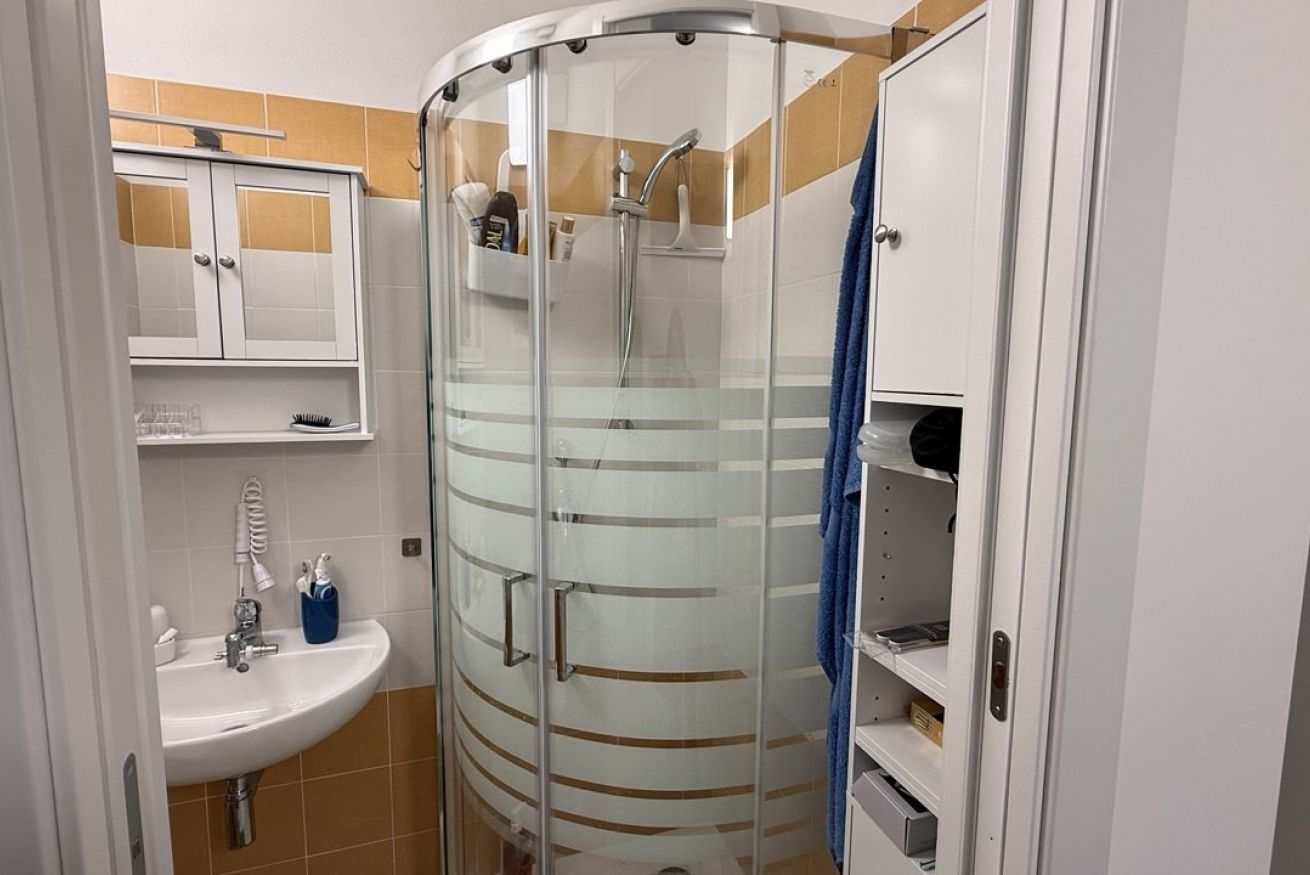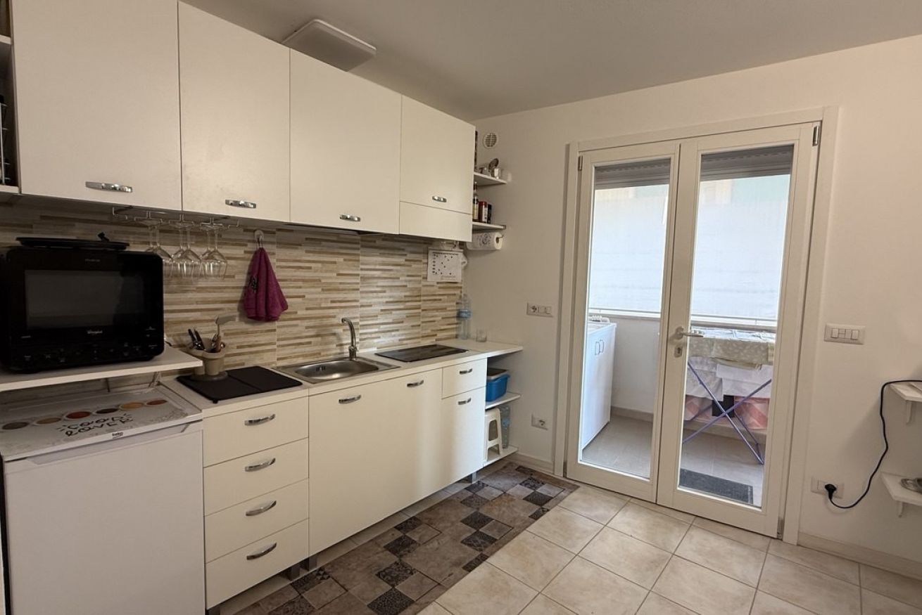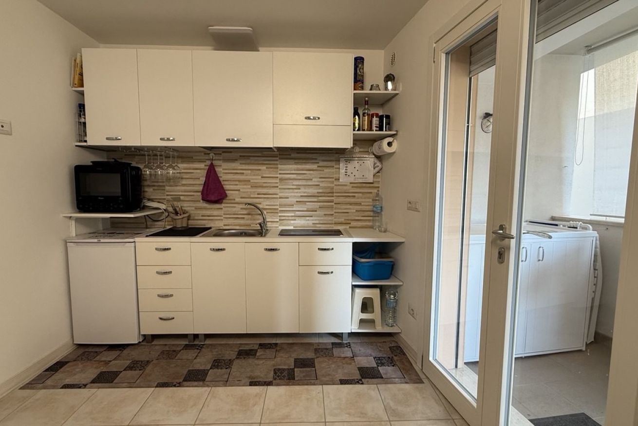 From the kitchen, there is direct access to a private terrace, a reserved and functional outdoor space equipped with an outdoor sink—particularly useful when returning from the beach or for daily needs—and a cabinet with an integrated washing machine.
