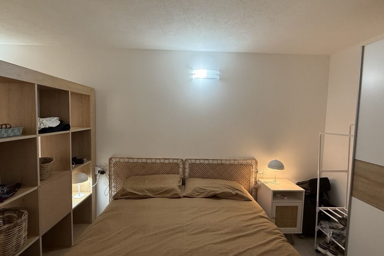 The sleeping area is elegantly separated from the living area by a charming bookcase, a design solution that ensures privacy while maintaining harmony and brightness throughout the space.